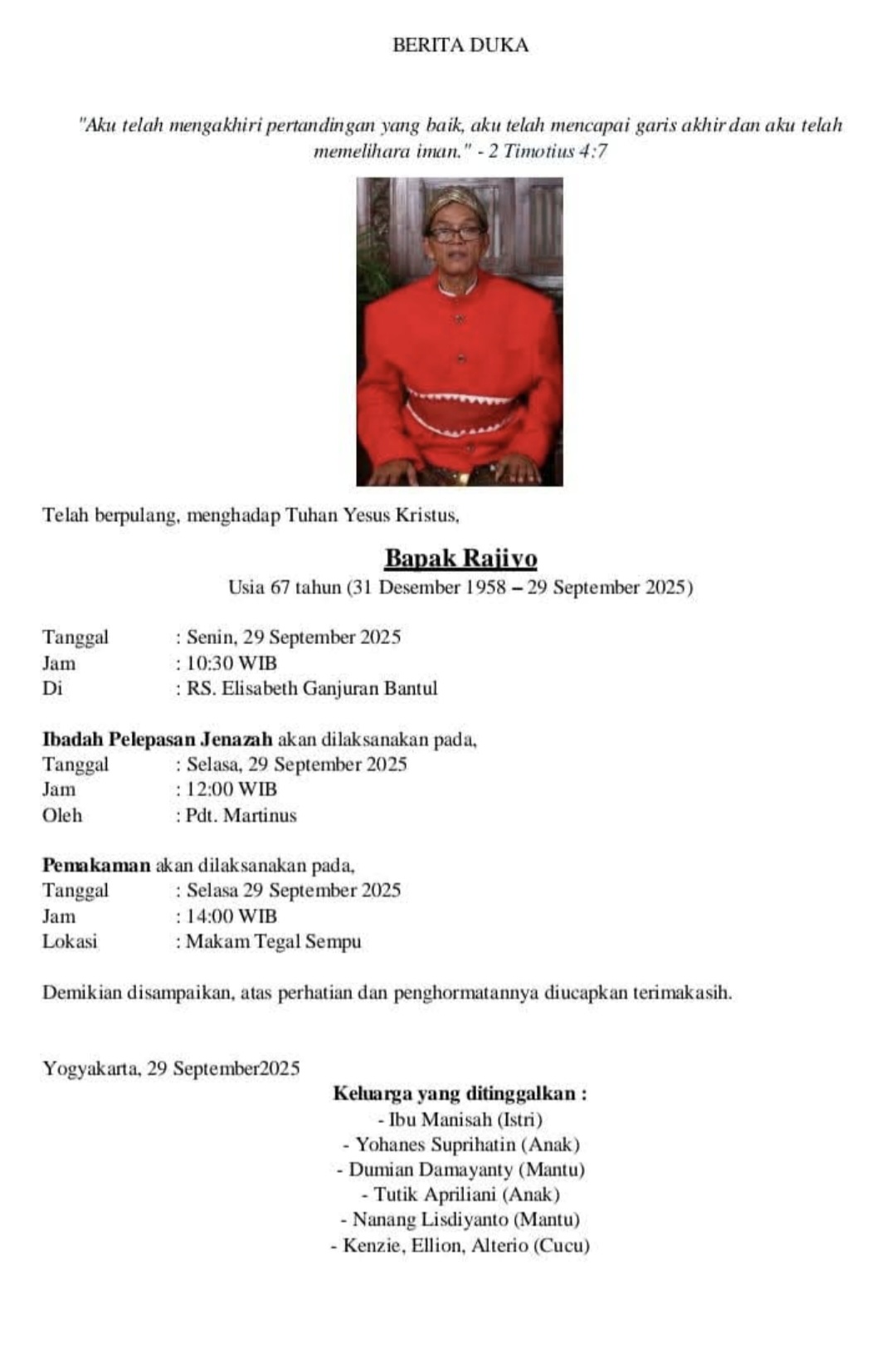 Pemakaman hari ini Tgl 15 Juli 2024 Senin Pukul 14.00 wib di pemakaman Mojoloyo, sumber kidul, kalitirto, berbah Yogyakarta.